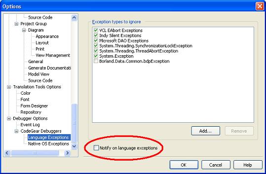 TOOLS -> OPTIONS -> DEBUGGER OPTIONS -> CODEGEAR DEBUGGERS -> LANGUAGE EXCEPTIONS según podéis ver en el dibujo que se muestra a continuación