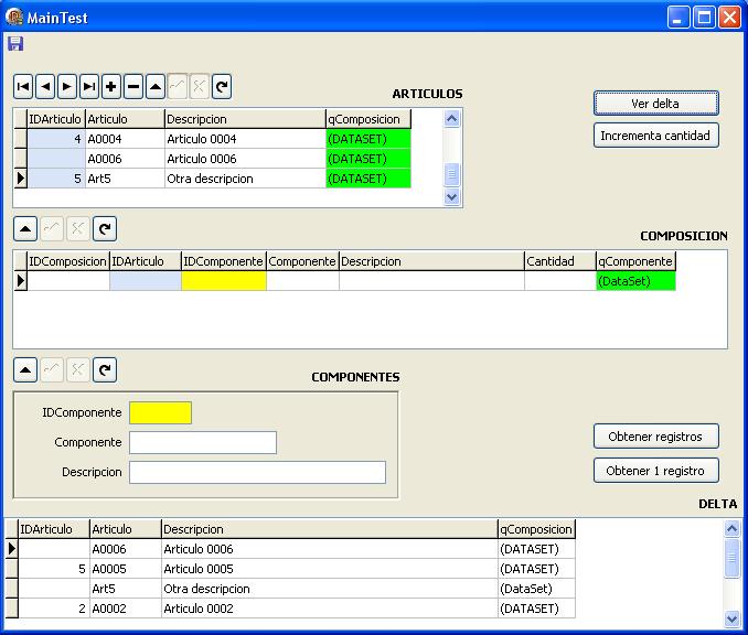La rejilla inferior os muestra el contenido del registro de actualizaciones. La estructura es identica a nivel de campos, a la que contiene la propiedad Data, como ya hemos comentado. Pero en el delta, por cada registro existente en el data, pueden existir máximo un par de registros vinculados a éste. Segun el caso, ya que para las inserciones o los borrados tan solo necesitamos un registro y mantener en algun «sitio» algo que nos diga si es un borrado o una inserción (en ese punto interviene UpdateStatus con los valores [usModified, usInserted, usDeleted]). En el caso de las modificiones, el primero registro representa el contenido original y el segundo los nuevos valores que toma.