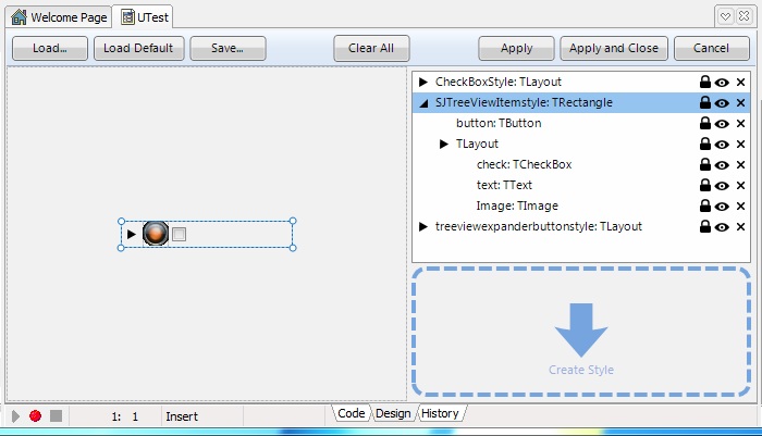 Finalmente, añadimos un componente TStyleBook a nuestro formulario. Este componente va a ser usado para guardar una colección de estilos. De hecho puede ser usado a nivel de formulario, permitiendo asignar la propiedad STyleBook del form, y recuperar de un fichero de estilos, aquellos definidos en el contenido, sobrescribiendo los recursos a traves del nombre de estilo. La manipulación del editor de estilos, cargando el fichero de estilos que definimos anteriormente, producirá que el formulario haga persistencia de la propiedad Resource del componente TStyleBook, permitiendo que sea sea recuperados los estilos durante la carga de la aplicación y encontrados por las rutinas de búsqueda a través del nombre.