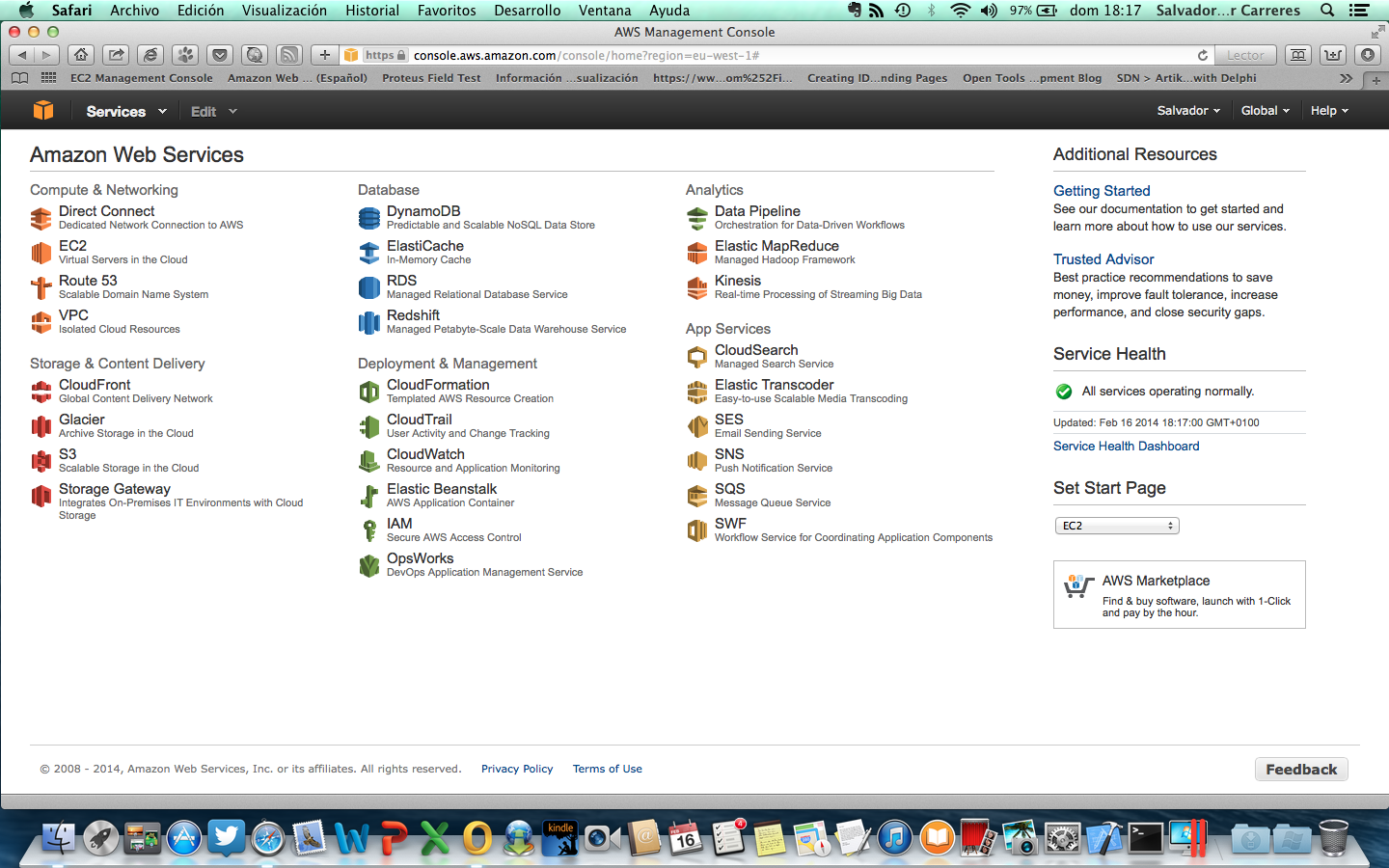 La idea que uno puede tener de sus servicios antes de conocerlos puede ser un tanto vaga ya que si os fijáis en la imagen superior, AWS recoge tanto las áreas de computación y redes, almacenamiento de datos, analítica, desarrollo y aplicaciones de servicio. He contado a bote pronto unos 27 servicios distintos, gestionados a través de un interfaz web y una consola de gestión de servicios que nos permitirán administrarlos de una forma relativamente sencilla, sobretodo si tenemos en cuenta la complejidad que encierran.
